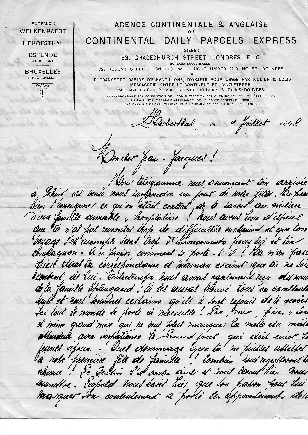 A tout seigneur son dû. Notre intérêt dans cette documentation ne se porte pas spécialement sur la composition de la famille Muller de l'époque. Cependant, en remerciement de la confiance qui ladite famille m'a accordée, je publie la suivante lettre qui parle largement de cette famille et signée par le frère de Jean-Jacques Muller qui semble également ingénieur et que nous laissons à votre appréciation. Le compagnon de voyage dont question est Cadiat, un des collaborateurs de Muller. Quant au frère, il ne décline pas son prénom.